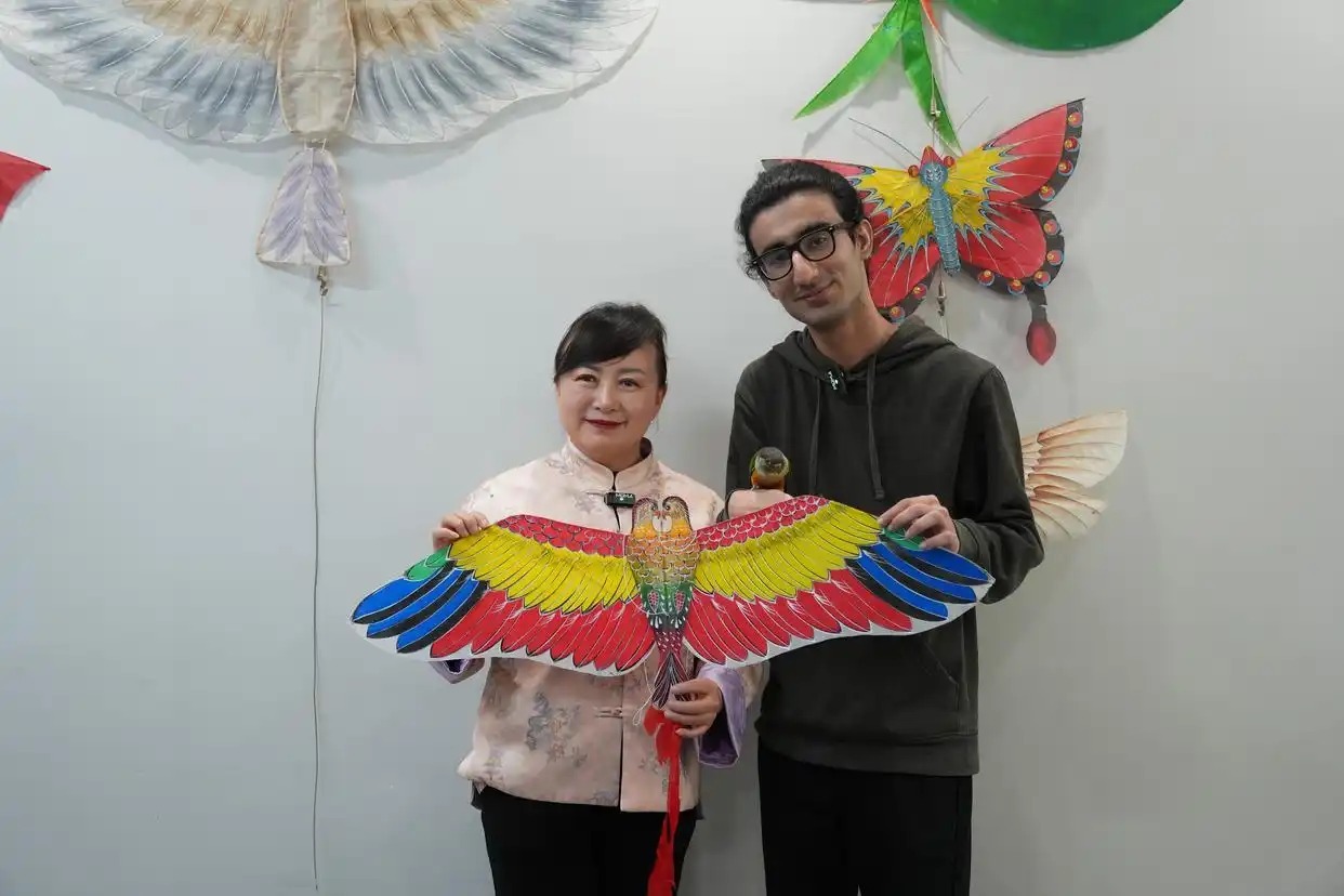 图为周瑜和宋长虹手持刚刚制作完成的《双头鹦鹉》风筝合影留念。当最后一笔落下,这只承载着传统技艺与个人心愿的风筝也宣告完成。周瑜感慨道:“对于中国人来说,放风筝不只是好玩,更是一场对话——与天空对话,与历史对话。风筝不只是一个玩具,它是生活在天空中的精灵,是一幅流动的宋画。做风筝,做的是心意;放风筝,放的是念想。把愿望系在线上,看着它飞向高空,这就是中国人最朴素的浪漫。”“我的父亲是在近乎失明的情况下扎制出《百蝶图》的。这件作品,是河南省2019年唯一入围中国民间文艺最高奖‘山花奖’的作品。”宋长虹说,“目前,我们把多款风筝设计成了材料包,让体验者在制作过程中也能感受到传统文化的魅力。我也是从父辈那里接过这门手艺,希望把它更好地传承下去、创新发展。”传承,从来不是将过去封存。宋长虹告诉周瑜,受家庭环境熏陶,她的儿子也选择了美术专业,如今已大学毕业,并从年轻人的视角设计了许多作品。她相信,通过一代代传承,这门手艺、这份心意,会像春风里的纸鸢如今,春风又起,纸鸢正飞。然而,随风飞上天空的,从来不只是纸与竹,更是中国人心中那些难以言说的情感与期盼,是“天人合一”最朴素也最深沉的浪漫。举报/反馈