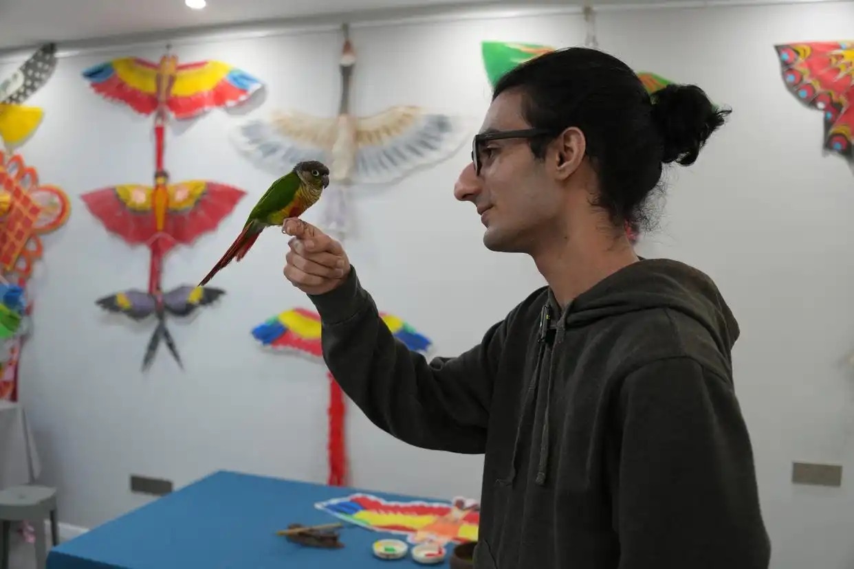图为周瑜在开封“宋室风筝”工作室。北宋时期,开封(时称东京汴梁)城市繁华、市民生活富足。每到清明踏青时节,放风筝便成为东京百姓不可或缺的娱乐活动。“苏汉臣《百子图》中就绘有放风筝的生动画面,从侧面折射出当时风筝产业的繁荣。”宋长虹告诉周瑜。“老师,‘宋室风筝’为什么不叫‘宋氏风筝’?这个‘室’字有什么特别的含义吗?”周瑜一边端详着手中的风筝,一边好奇地问道。宋长虹笑了笑,放下手中的工具,解释道:“这有两种说法。一种说法是,北宋皇室中曾流传出独特的扎纸技法与绘画技法,我们这门手艺便与之有渊源。另一种说法更贴近我们本家。我家世代做风筝,传到我已是第六代。‘宋室’里的‘室’字,是因为过去祖辈制作风筝,全在家里完成;做好的风筝,也多在家里陈列、售卖。”《百蝶图》《五蝠拜寿》《双头鹦鹉》……记者在宋长虹的工作室里看到许多以象形类品种闻名的宋室风筝。“每一款风筝都有吉祥寓意。”宋长虹拿起一只《双头鹦鹉》风筝,向周瑜介绍说,“鹦鹉和‘英武’谐音,寓意英明神武。在中国传统文化中,鹦鹉还代表着爱情,它的特性是爱家、护家。同时,鹦鹉也是长寿鸟。而双头造型,则寓意百年好合、比翼双飞。其对称结构,不仅考验制作者的技艺,更蕴含着中华传统文化中平衡与和谐的哲学思想。”在宋长虹的指导下,周瑜开始学习制作《双头鹦鹉》风筝。他先按照图样,将竹篾弯折出对称的风筝骨架;然后将裁剪好的纸面轻轻覆上,再蘸取浆糊,一点点抹平褶皱。他神情专注,动作沉稳,生怕一个不慎影响了整体的平整与张力。待纸面干透,他又拿起画笔,在宋长虹的示范下,为鹦鹉细细勾勒羽翼。随着红、绿、蓝等颜色在纸面上渐渐铺展,一只灵动的双头鹦鹉,仿佛也悄然“活”了起来。